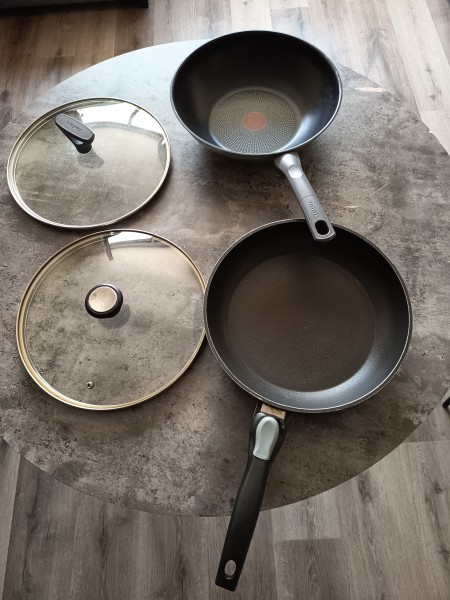 Vok in ponev barv kot na sliki, premer 29 cm oba. Ne uporabljamo ju več, ker smo kupili nov tip posod.
