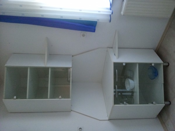 Bela kotna vitrina s steklenimi vrati. Razstavljena. Potrebna montaža in vijačenje v steno.