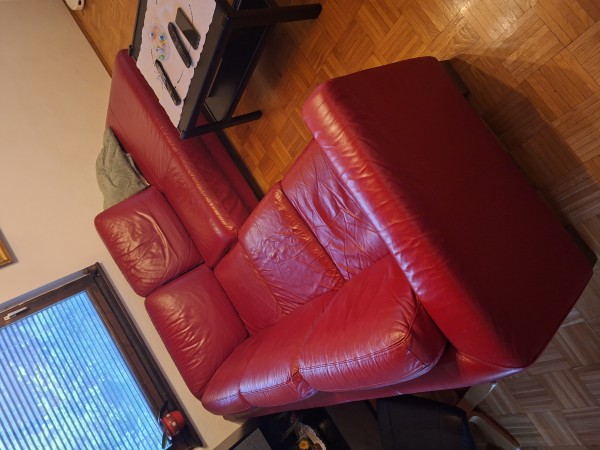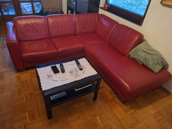 Podarimo kotno sedežno, usnjeno, cca. 230×230cm, rdeče barve, rabljeno.