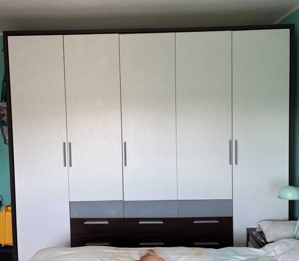 5-delna garderobna omara (mere zunanjega ogrodja): dolžina 258 cm, višina 223 cm, globina 64 cm.