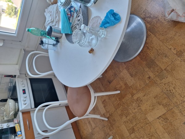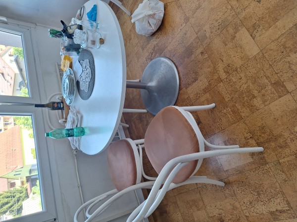 Podarim belo okroglo mizo (fi 97 cm) z srebrno nogo in 4 bele stole podarim.