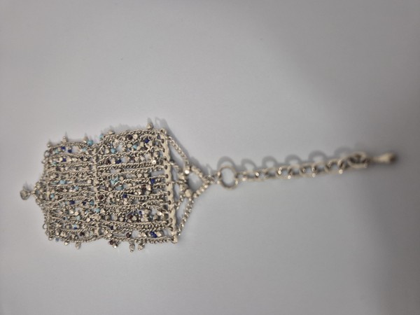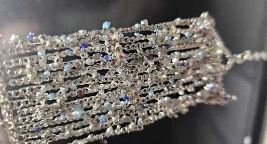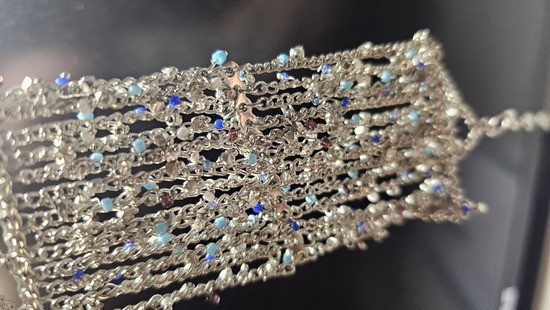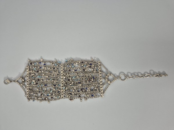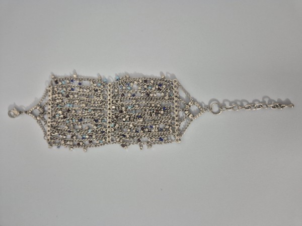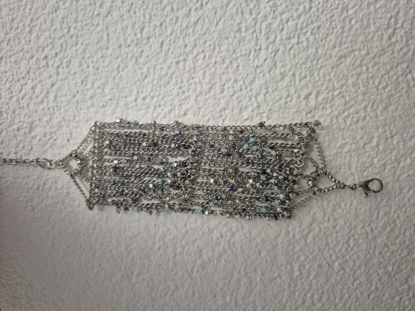 Prodam čudovito, bogato okrašeno zapestnico iz (jeklo), ki jo sestavlja več nežnih verižic. Zapestnica je posuta z drobnimi kristalčki v modrih in nevtralnih odtenkih, ki se ob svetlobi čudovito svetijo. Srebrna osnova z akvamarinsko modrimi in temno modrimi detajli. Idealna za svečane dogodke, poroke ali kot posebno darilo.