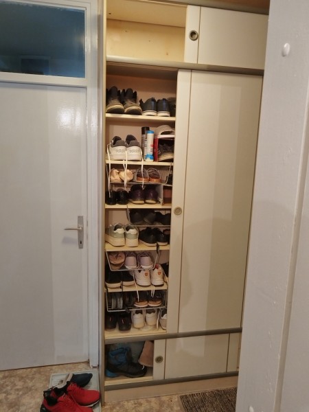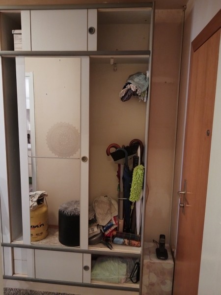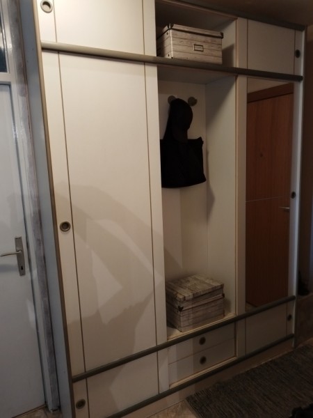 Predsobna omara bele barve. Višina je 237 cm, dolžina 176 cm in širina 37 cm.